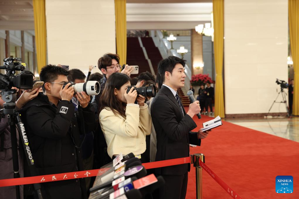 A journalist asks a question during an interview attended by ministers after the opening meeting of the third session of the 14th National People's Congress (NPC) at the Great Hall of the People in Beijing, capital of China, March 5, 2025. (Xinhua/Lyu Shuai)