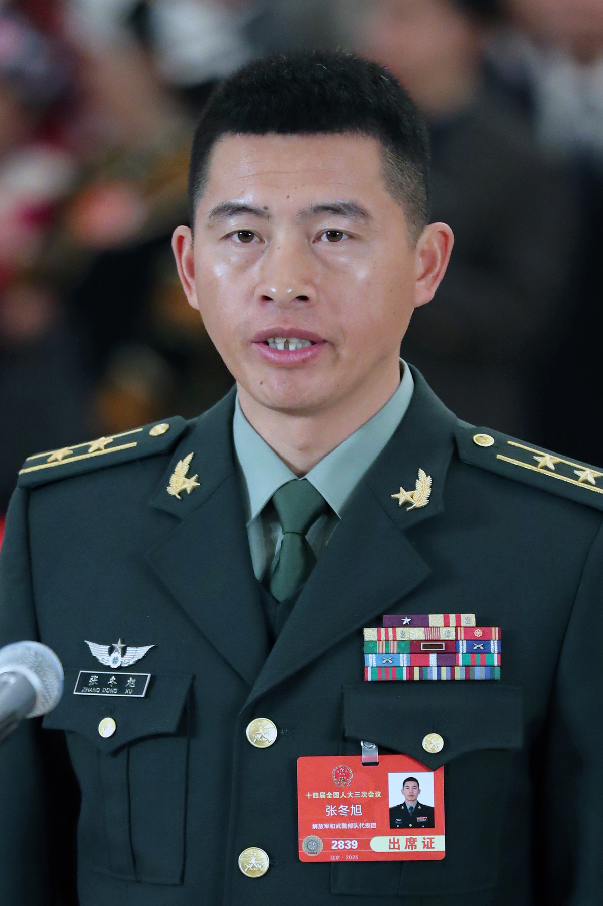 Lieutenant Colonel Zhang Dongxu, commander of a combined combat battalion of the People's Liberation Army Ground Force, also a deputy to the 14th National People's Congress, attends a group interview ahead of the opening meeting of the third session of the 14th NPC at the Great Hall of the People in Beijing, on March 5, 2025. (Kuang Linhua/chinadaily.com.cn)