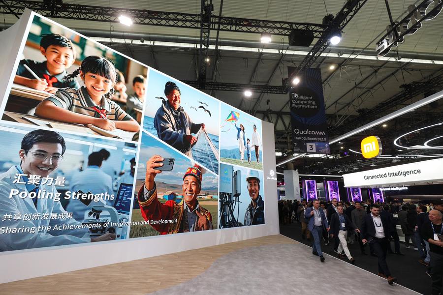 People walk past the booth of China Mobile at the 2025 Mobile World Congress in Barcelona, Spain, March 3, 2025. (Xinhua/Zhao Dingzhe)