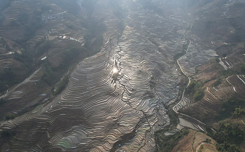 With the arrival of spring, terraced fields spanning tens of thousands of mu (1 mu is about 667 square meters) in Lyuchun county, Honghe Hani and Yi Autonomous Prefecture in southwest China's Yunnan Province come to life. After the spring plowing begins, the terraced fields are filled with water for rice planting. Viewed from above, the fields shimmer with rippling light, layer upon layer, resembling a colorful masterpiece embedded among the emerald green mountains.