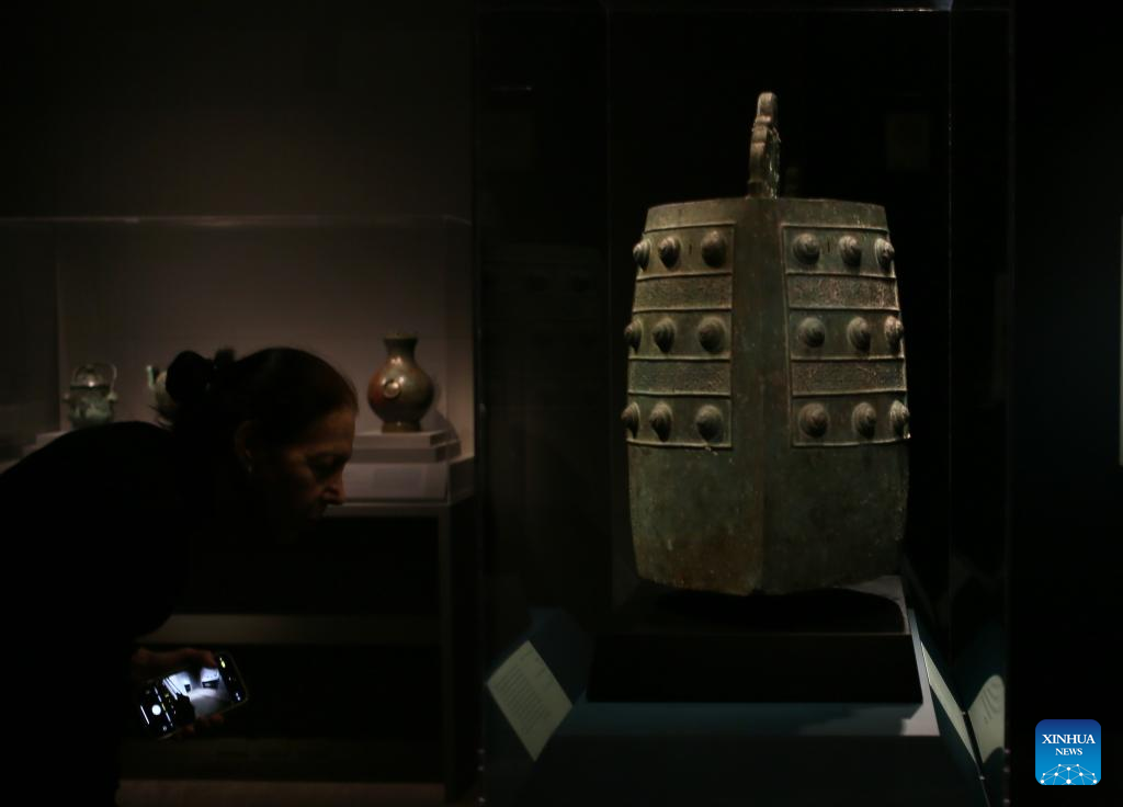 A visitor takes a close look at a Bo Bell dating back to the Spring and Autumn period (770 BC-476 BC) during a press preview of an exhibition titled Eternal Offerings: Chinese Ritual Bronzes from the Minneapolis Institute of Art, at China Institute Gallery in New York, the United States, on March 5, 2025. (Xinhua/Zhang Fengguo)