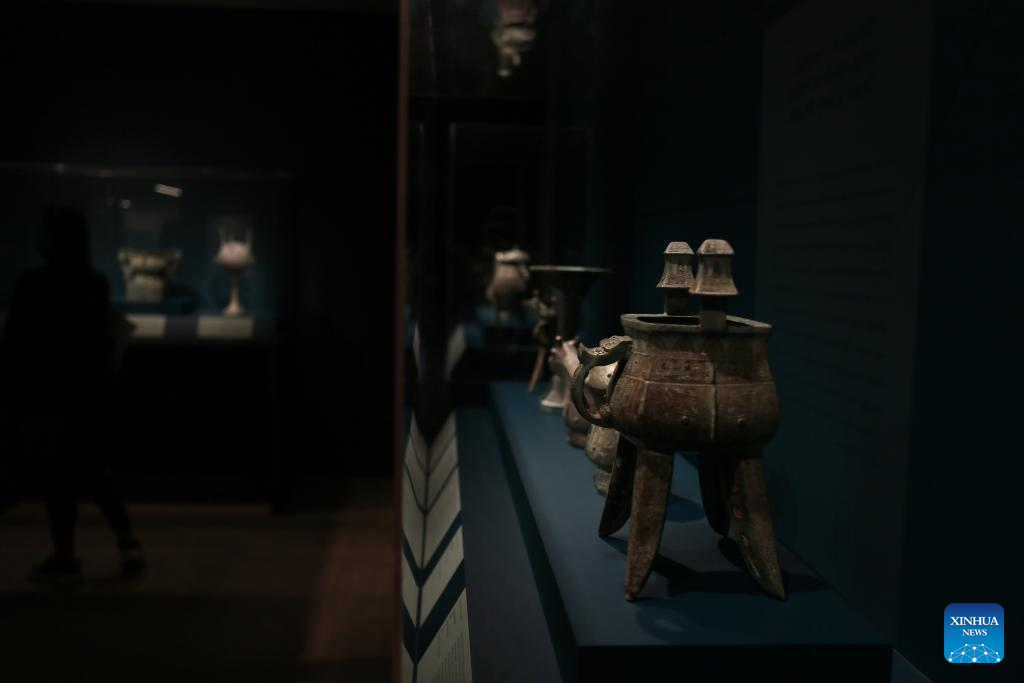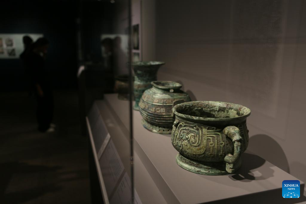 Photo taken on March 5, 2025 shows ancient Chinese bronze vessels on display during a press preview of an exhibition titled Eternal Offerings: Chinese Ritual Bronzes from the Minneapolis Institute of Art, at China Institute Gallery in New York, the United States. (Xinhua/Zhang Fengguo)