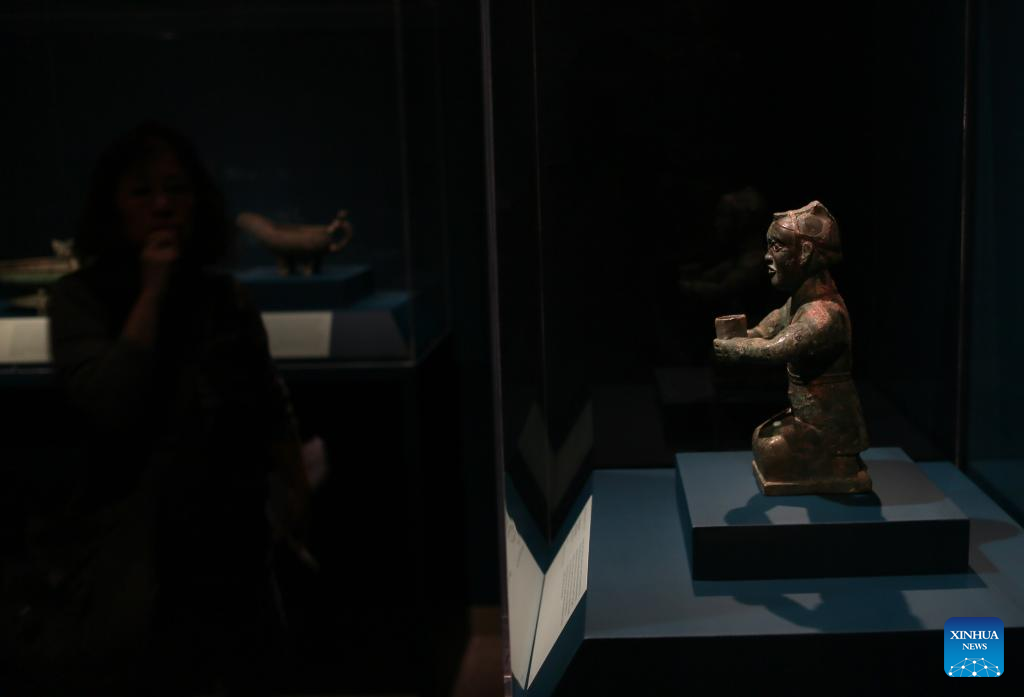 A visitor views a kneeling figure dating back to the Warring States period (475 BC-221 BC) during a press preview of an exhibition titled Eternal Offerings: Chinese Ritual Bronzes from the Minneapolis Institute of Art, at China Institute Gallery in New York, the United States, on March 5, 2025. (Xinhua/Zhang Fengguo)