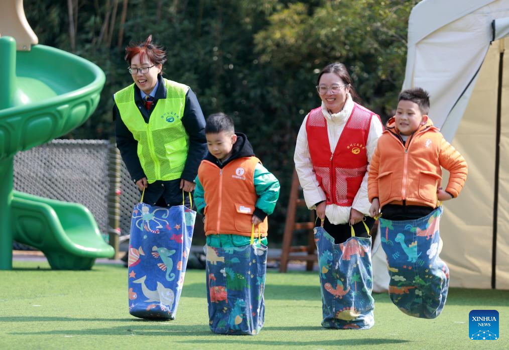 Volunteers play a game with children during an event celebrating the International Women's Day in a kindergarten in Yangzhou, east China's Jiangsu Province, March 6, 2025. Various activities are held across the country to mark the International Women's Day. (Photo by Meng Delong/Xinhua)
