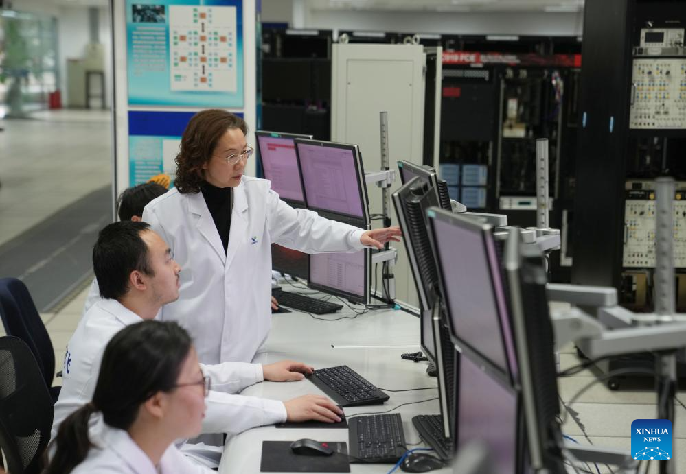 Zhao Chunling (1st R) works with her colleagues at a research institute of Commercial Aircraft Corporation of China (COMAC) in Shanghai, east China, March 5, 2025. (Xinhua/Liu Ying)