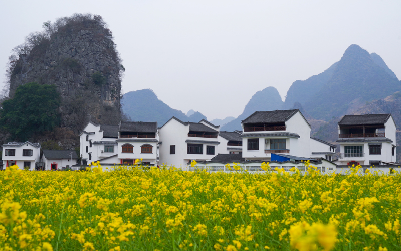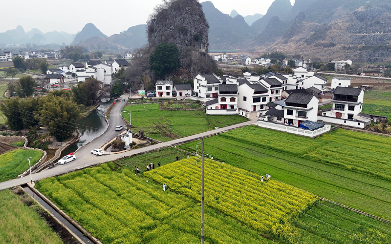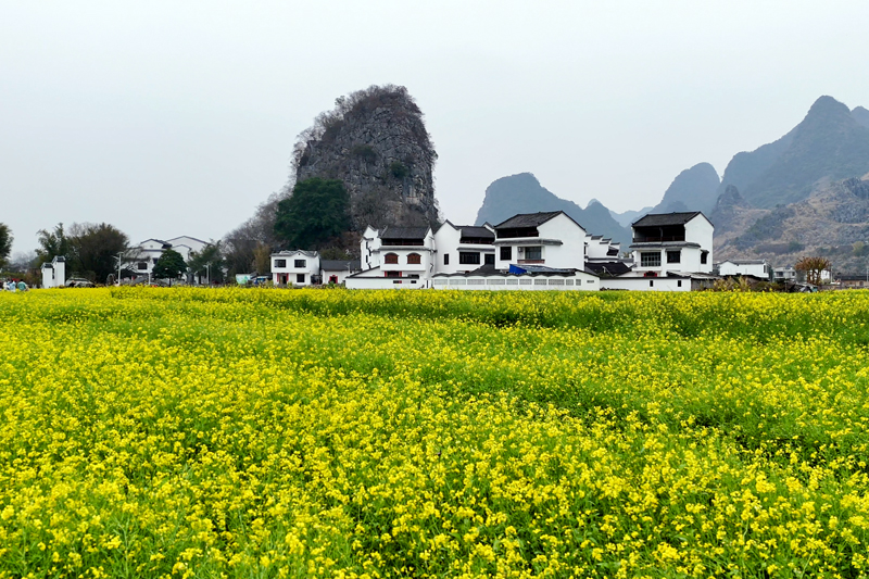 Photo shows rapeseed flowers with rural buildings featuring white walls and black roofs and mountains in Zhongdu township, Luzhai county, south China's Guangxi Zhuang Autonomous Region. (Photo/Wang Xiaoqiang)