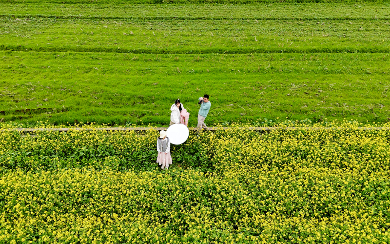 A beautiful picturesque springtime scene has unfolded in Zhongdu township, Luzhai county, south China's Guangxi Zhuang Autonomous Region these days, as the rapeseed flowers are now in full bloom. Tourists and photography enthusiasts have arrived in droves. Some stroll through the floral sea and enjoy the romance of spring, and some capture the beauty with their cameras, embracing the season's charm and vitality.