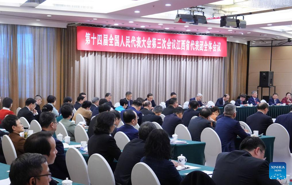 A group meeting of deputies from the delegation of Jiangxi Province is held at the third session of the 14th National People's Congress (NPC) in Beijing, capital of China, March 6, 2025. (Xinhua/Li Xiao)