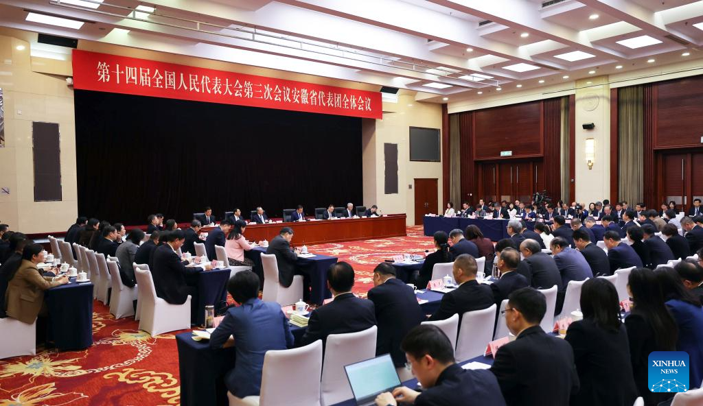 A group meeting of deputies from the delegation of Anhui Province is held at the third session of the 14th National People's Congress (NPC) in Beijing, capital of China, March 6, 2025. (Xinhua/Lu Ye)