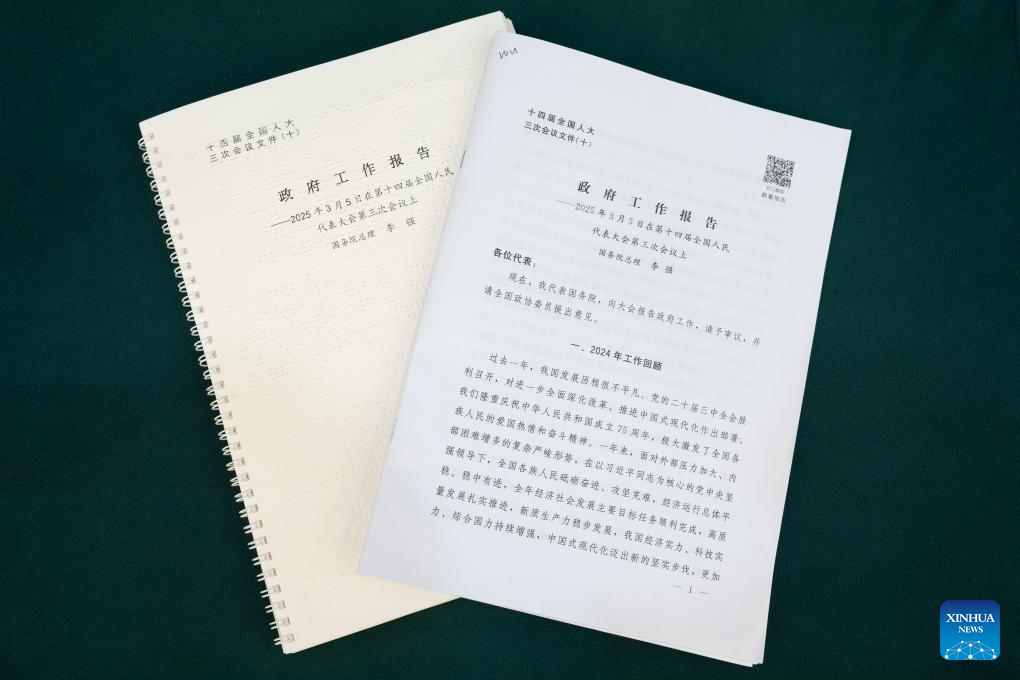 This photo shows the government work report in both Braille (L) and text at a meeting attended by national political advisors from the sector of welfare and social security at the third session of the 14th National Committee of the Chinese People's Political Consultative Conference (CPPCC) in Beijing, capital of China, March 5, 2025. During this year's two sessions, a Braille version of the government work report was provided for the first time to members of the CPPCC National Committee with visual impairments. The special document highlights China's care and support for people with disabilities. (Xinhua/Cai Yang)