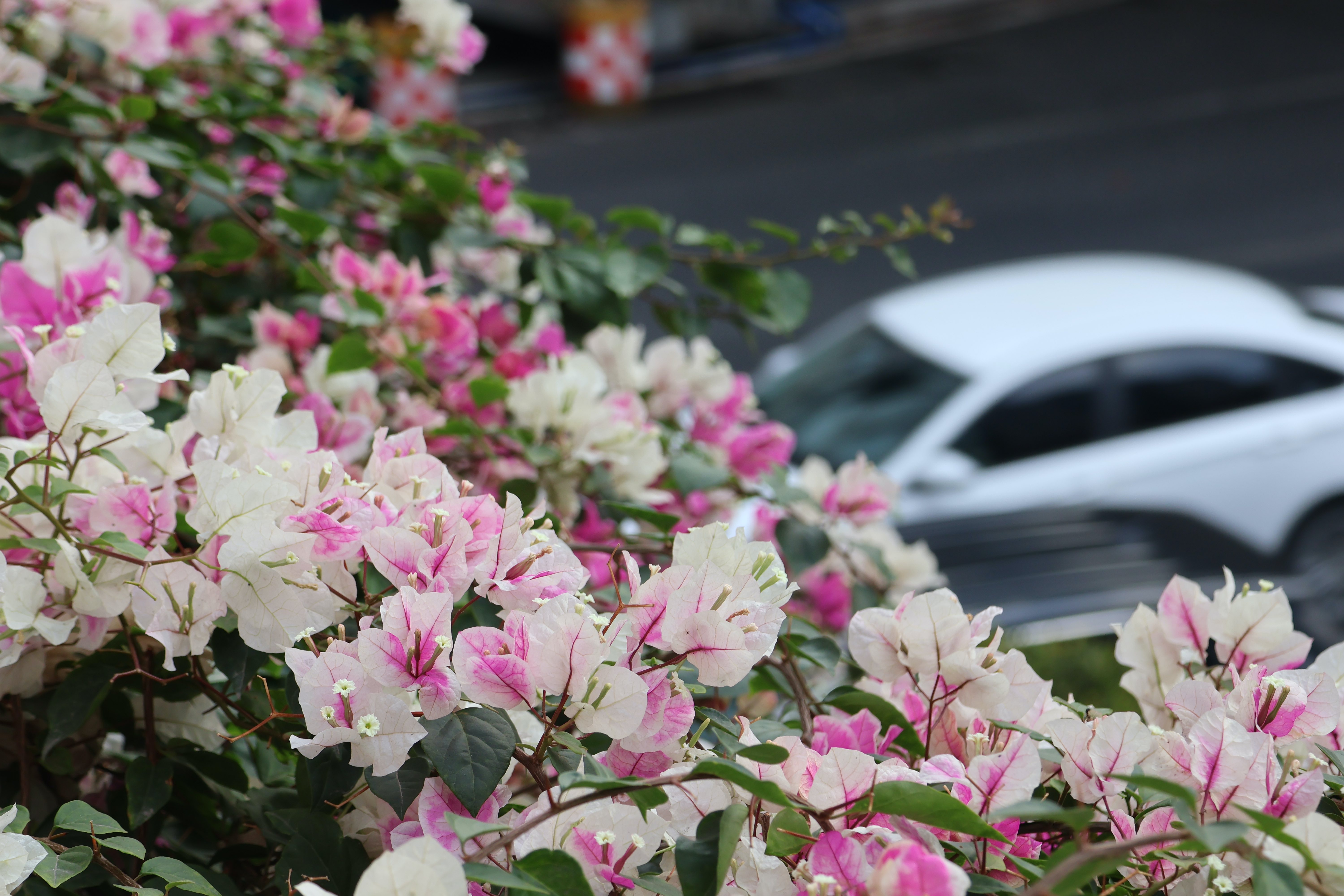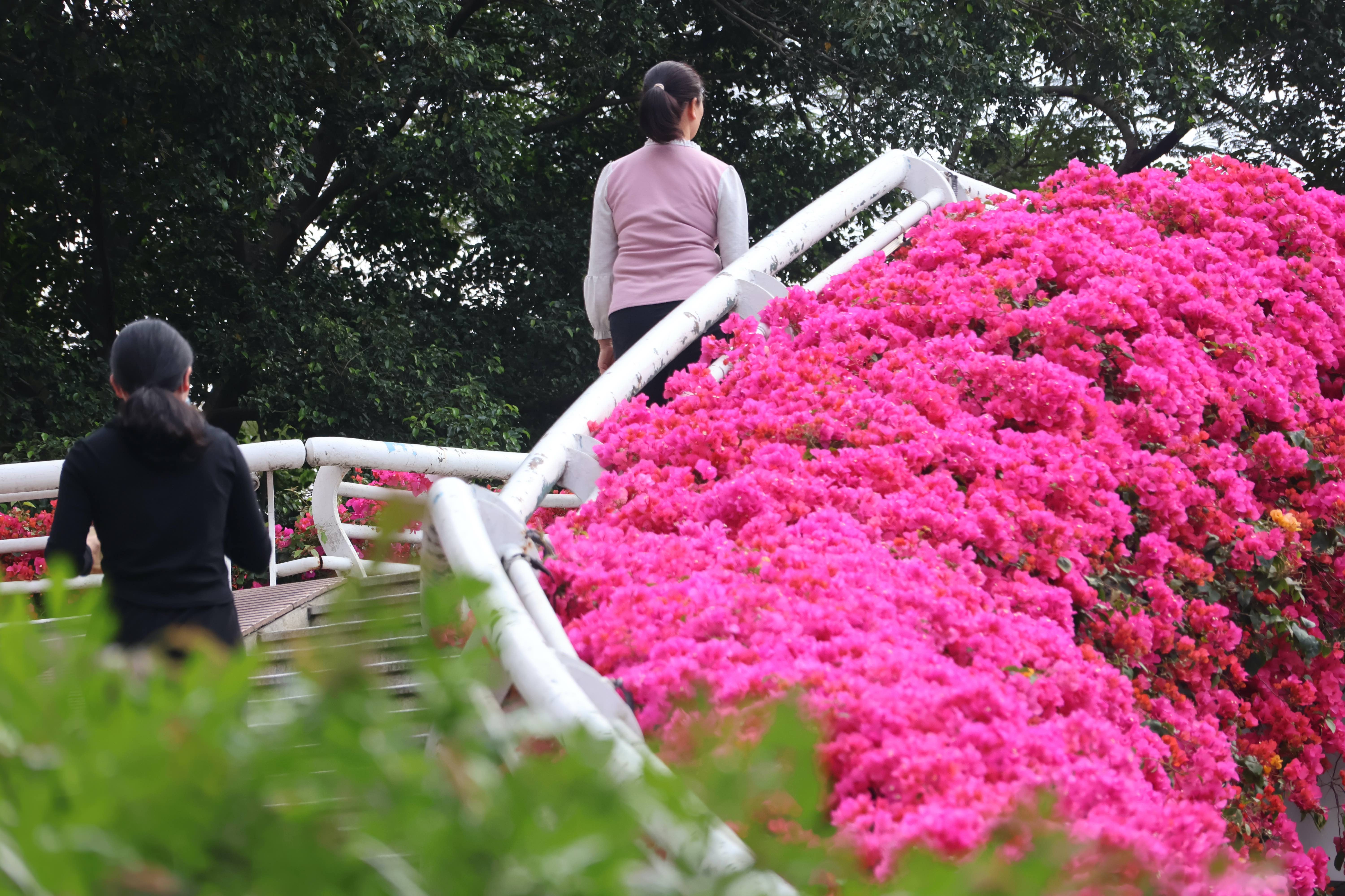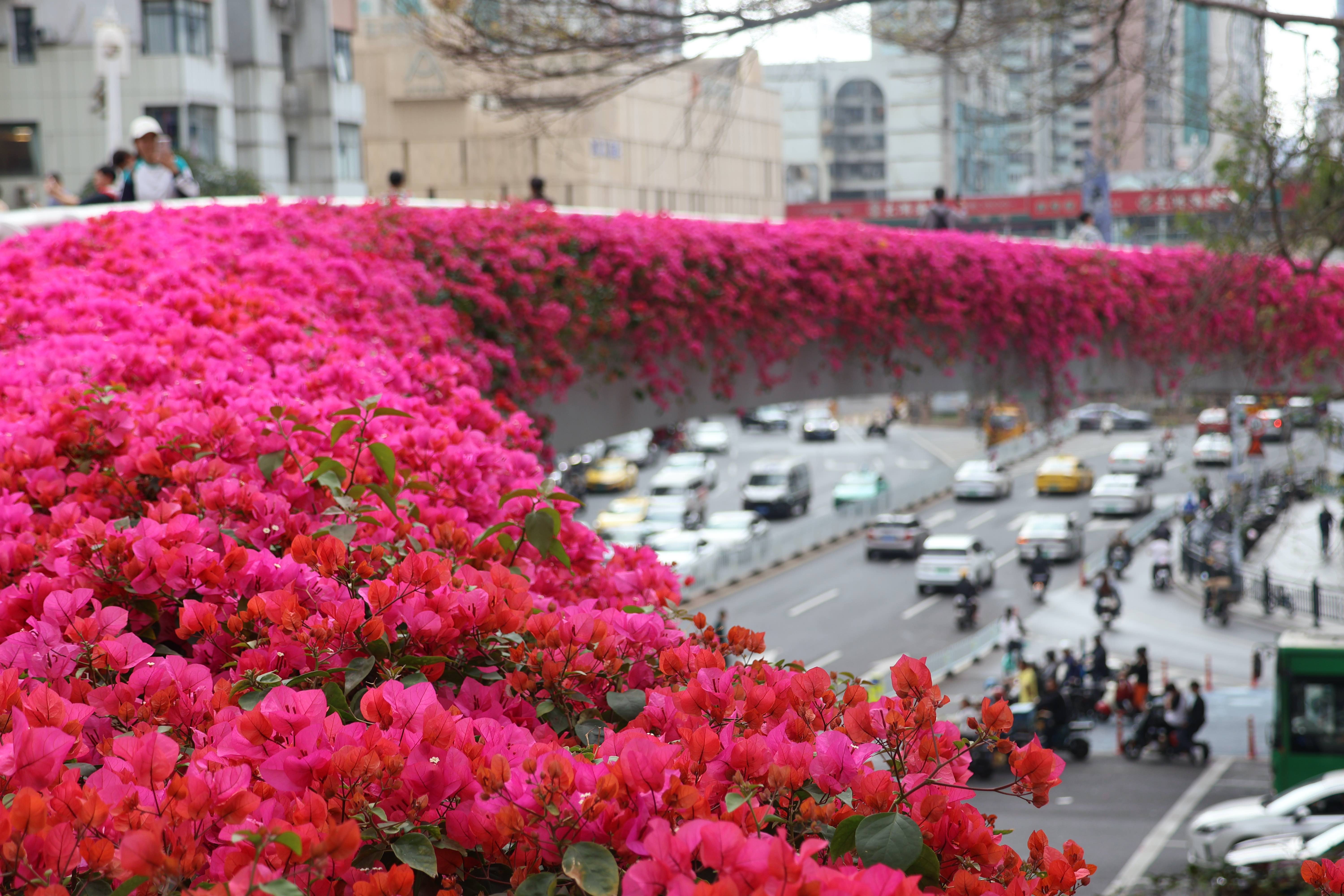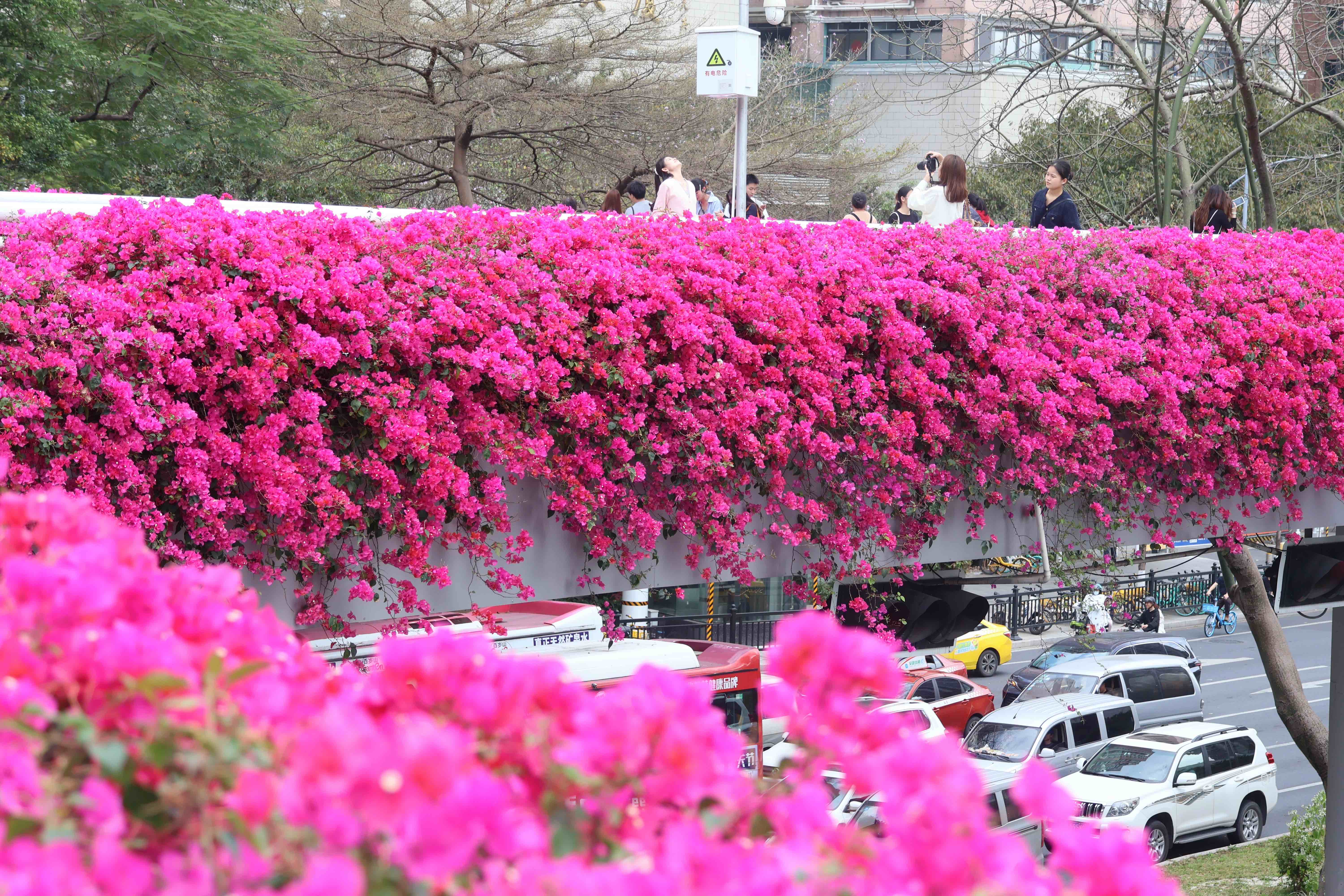 Among them, the pedestrian bridge at the intersection of Dongfeng Middle Road and Xiaobei Road is particularly eye-catching. The pink-and-white bougainvillea cascade like a waterfall, captivating passersby with their unique and vibrant hues. Meanwhile, the Wuyangcun pedestrian bridge is adorned with clusters of water-red bougainvillea, exuding the essence of spring and attracting locals and tourists to stop and take photos.