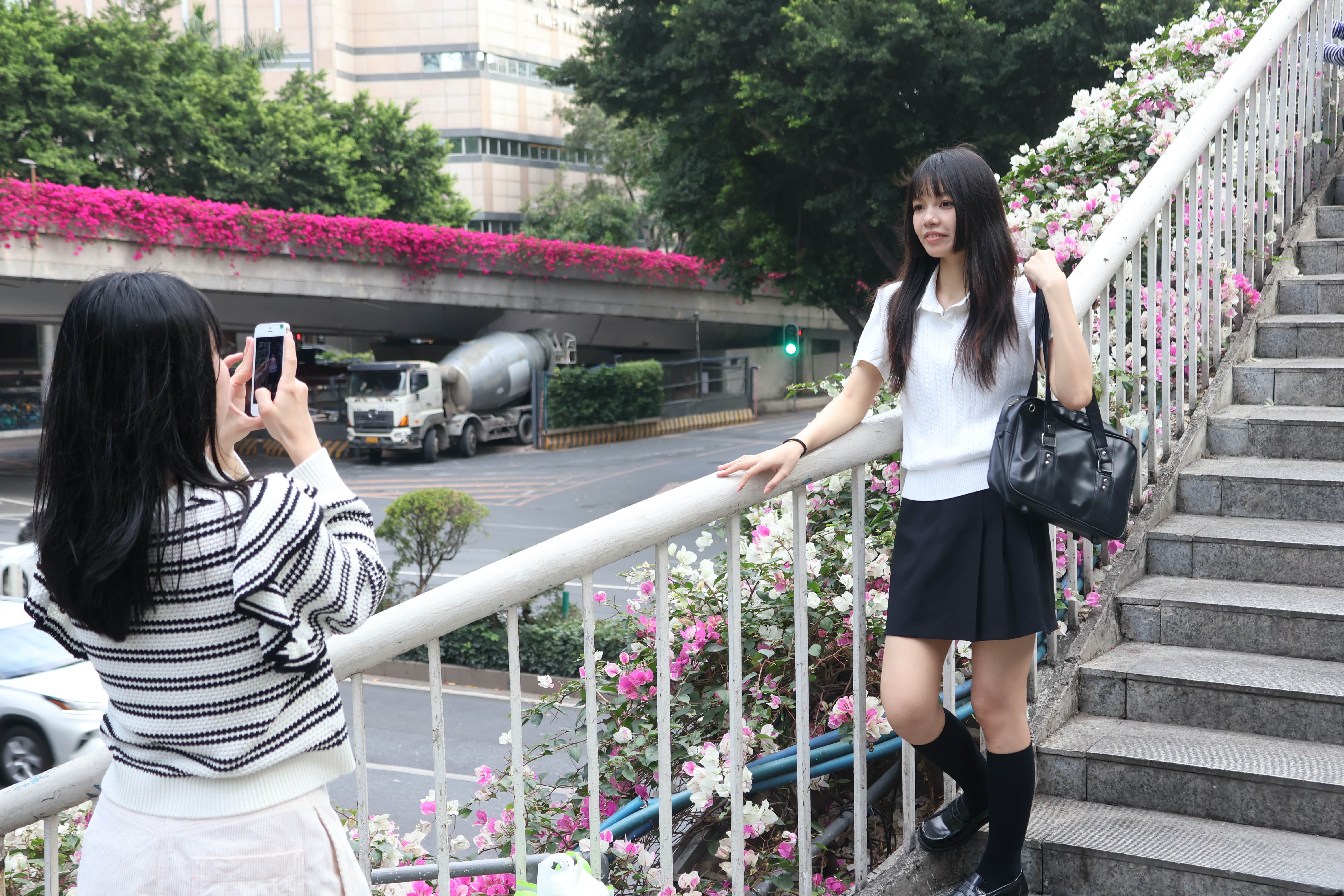 A girl takes photos of another girl and bougainvillea on a pedestrian bridge in Guangzhou, capital of south China's Guangdong Province. (People's Daily Online/He Shanfu)