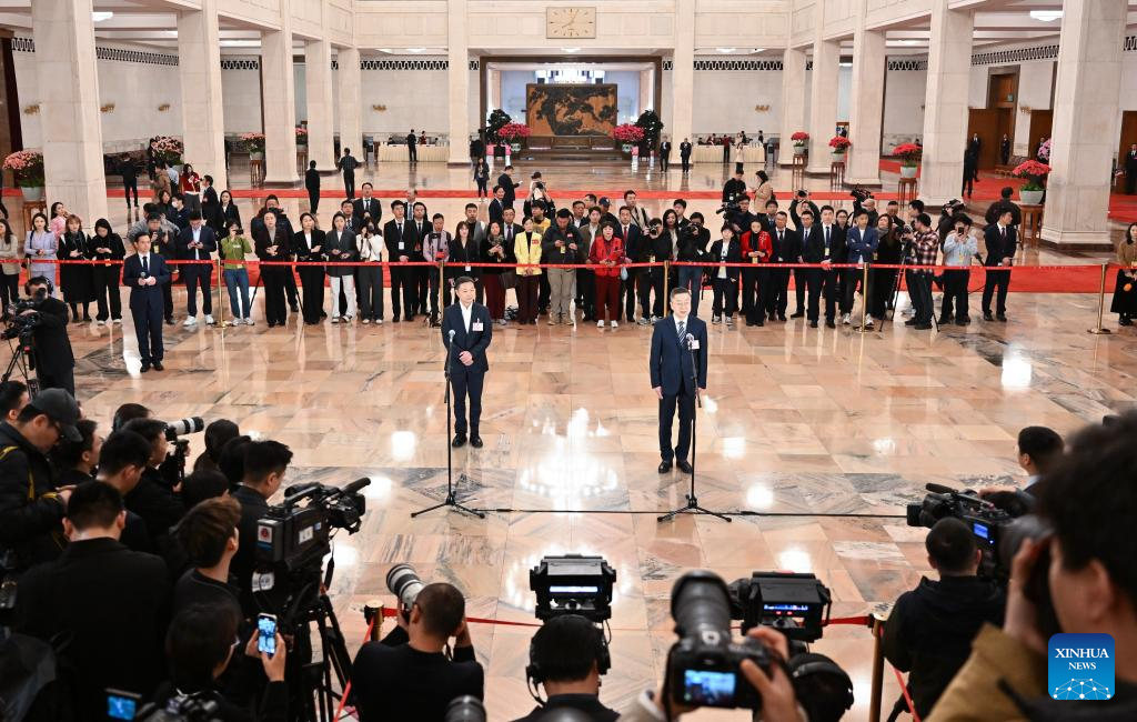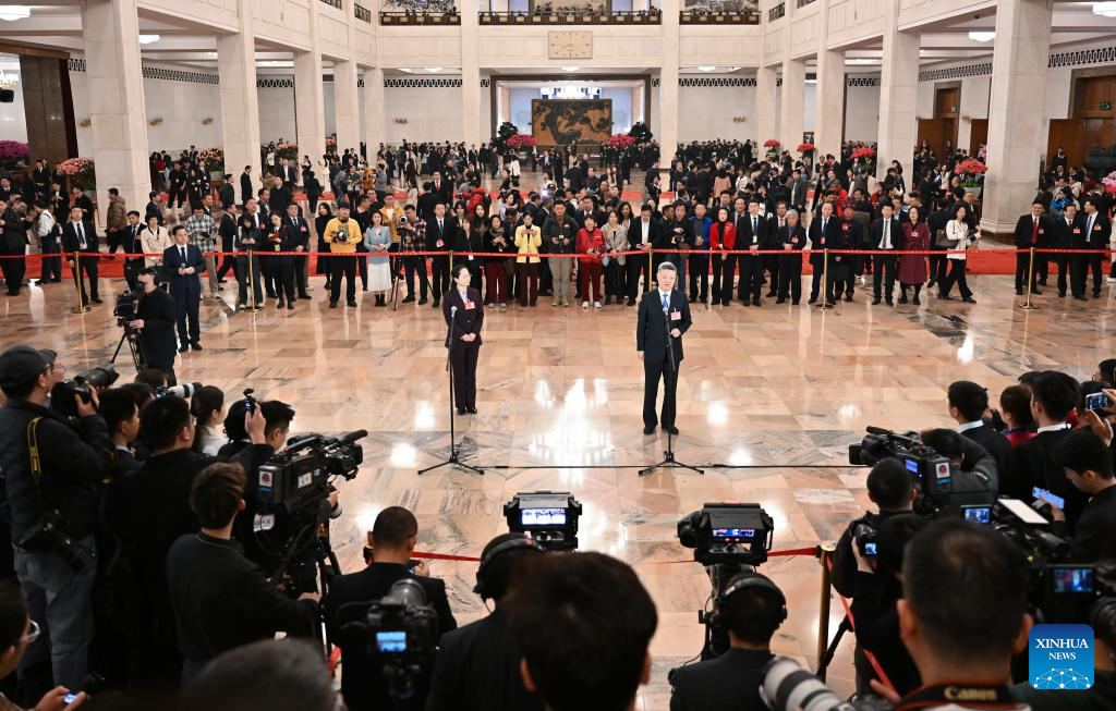 Deputies to the 14th National People's Congress (NPC) attend a group interview ahead of the second plenary meeting of the third session of the 14th NPC at the Great Hall of the People in Beijing, capital of China, March 8, 2025. (Xinhua/Xu Bingjie)