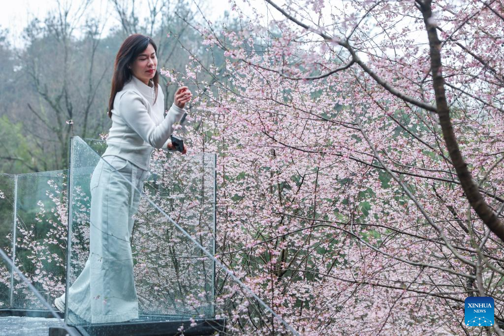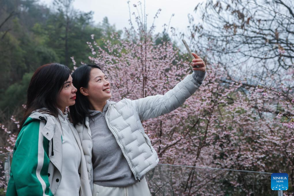 A tourist takes photos of cherry blossoms in Qianyuan Village of Sandu Town, Jiande City, east China's Zhejiang Province, March 6, 2025. In recent years, Sandu Town has helped local residents increase their income by promoting seasonal sightseeing routes featuring mountain blossoms, camping sites and homestays. (Xinhua/Xu Yu)