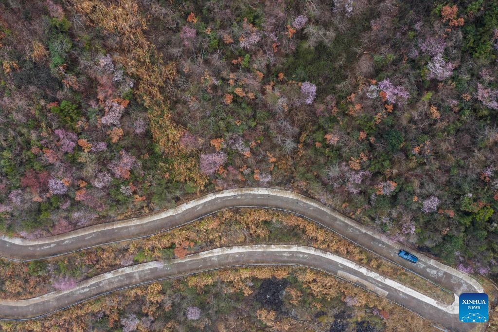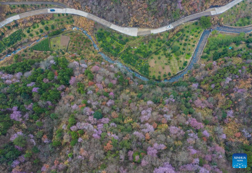 An aerial drone photo taken on March 6, 2025 shows cherry blossoms in Datang Village of Sandu Town, Jiande City, east China's Zhejiang Province. In recent years, Sandu Town has helped local residents increase their income by promoting seasonal sightseeing routes featuring mountain blossoms, camping sites and homestays. (Xinhua/Xu Yu)