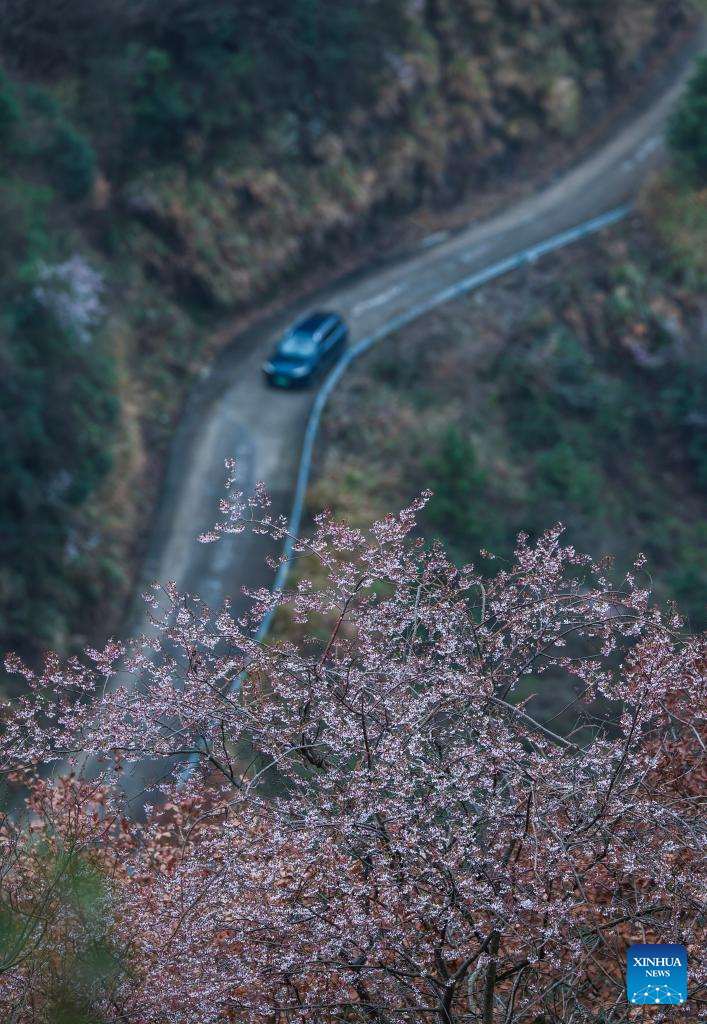 This photo taken on March 6, 2025 shows cherry blossoms in Wuxiang Village of Sandu Town, Jiande City, east China's Zhejiang Province. In recent years, Sandu Town has helped local residents increase their income by promoting seasonal sightseeing routes featuring mountain blossoms, camping sites and homestays. (Xinhua/Xu Yu)