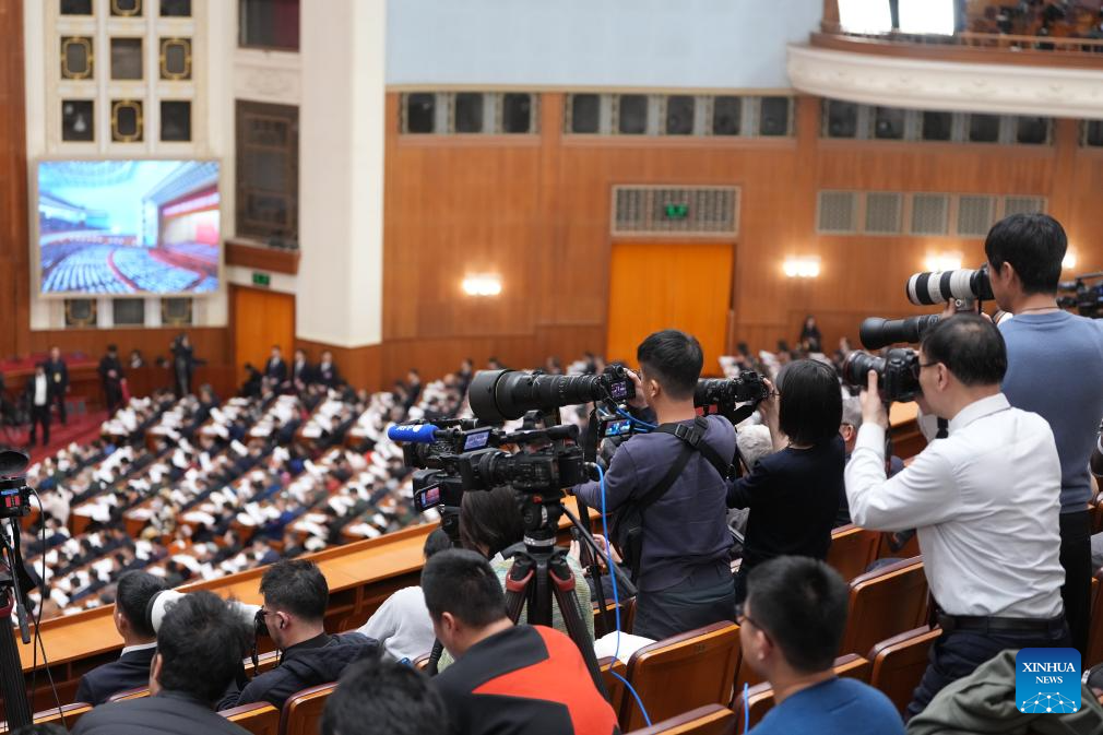 Journalists work at the second plenary meeting of the third session of the 14th National People's Congress (NPC) at the Great Hall of the People in Beijing, capital of China, March 8, 2025. (Xinhua/Chen Yehua)