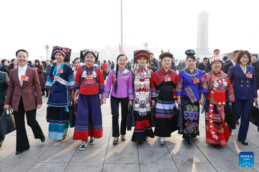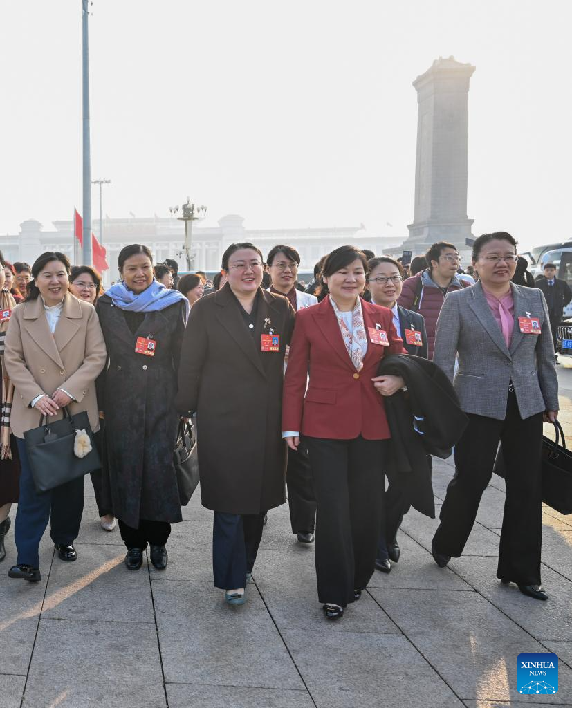 Deputies to the 14th National People's Congress (NPC) walk towards the Great Hall of the People for the second plenary meeting of the third session of the 14th NPC in Beijing, capital of China, March 8, 2025. (Xinhua/Chen Yehua)