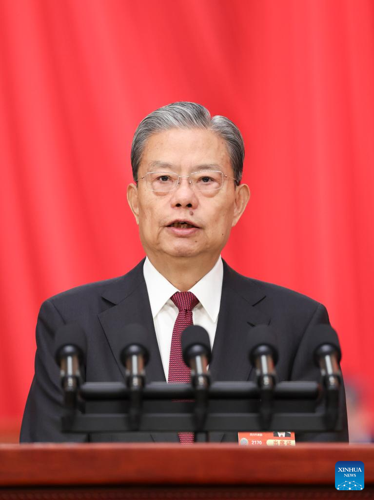 Zhao Leji, chairman of the National People's Congress (NPC) Standing Committee, delivers a work report of the NPC Standing Committee at the second plenary meeting of the third session of the 14th NPC at the Great Hall of the People in Beijing, capital of China, March 8, 2025. (Xinhua/Ding Haitao)
