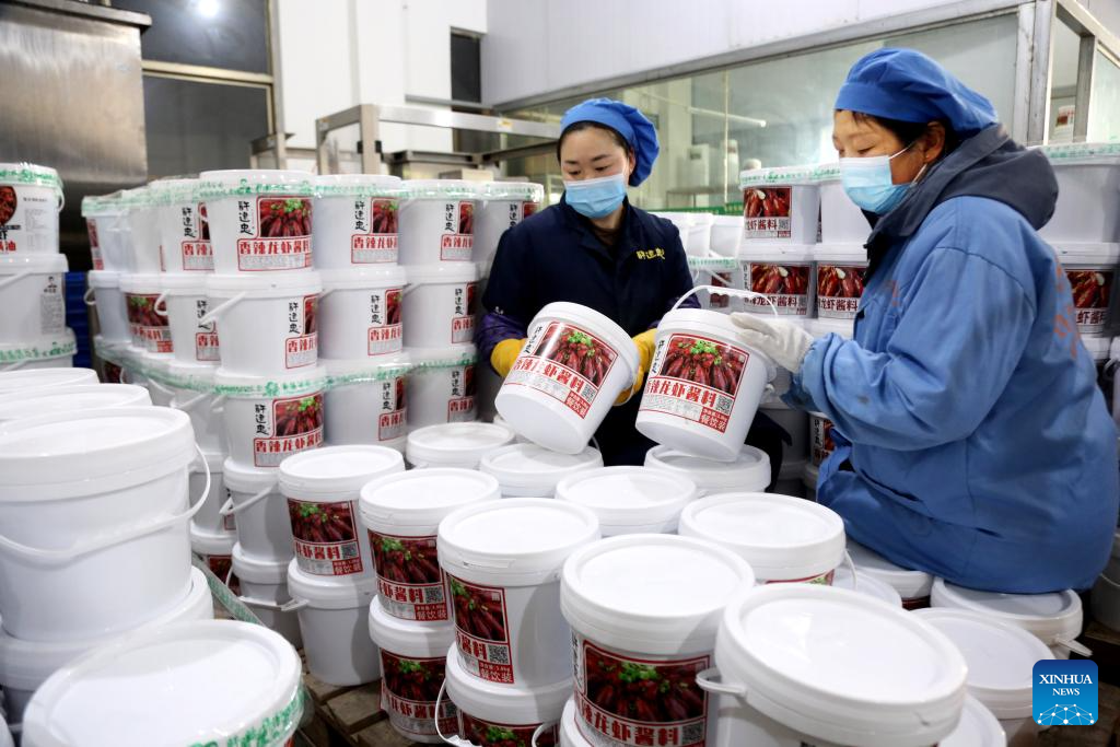 Workers operate at a crayfish condiment company in Xuyi County, east China's Jiangsu Province, March 8, 2025. As the temperature rises, crayfish are on the market in Xuyi County, a well-known crayfish production hub in China. In recent years, Xuyi has vigorously developed crayfish industry. The ecological breeding area of crayfish in the county has reached one million mu (about 66,667 hectares), and over 210,000 people are involved in the crayfish industry. Crayfish industry has become a boost to the local rural revitalization. (Photo by Wang Chun/Xinhua)