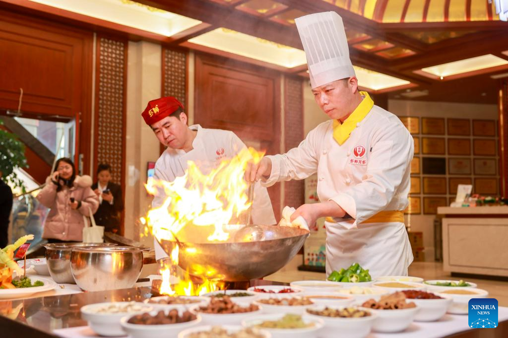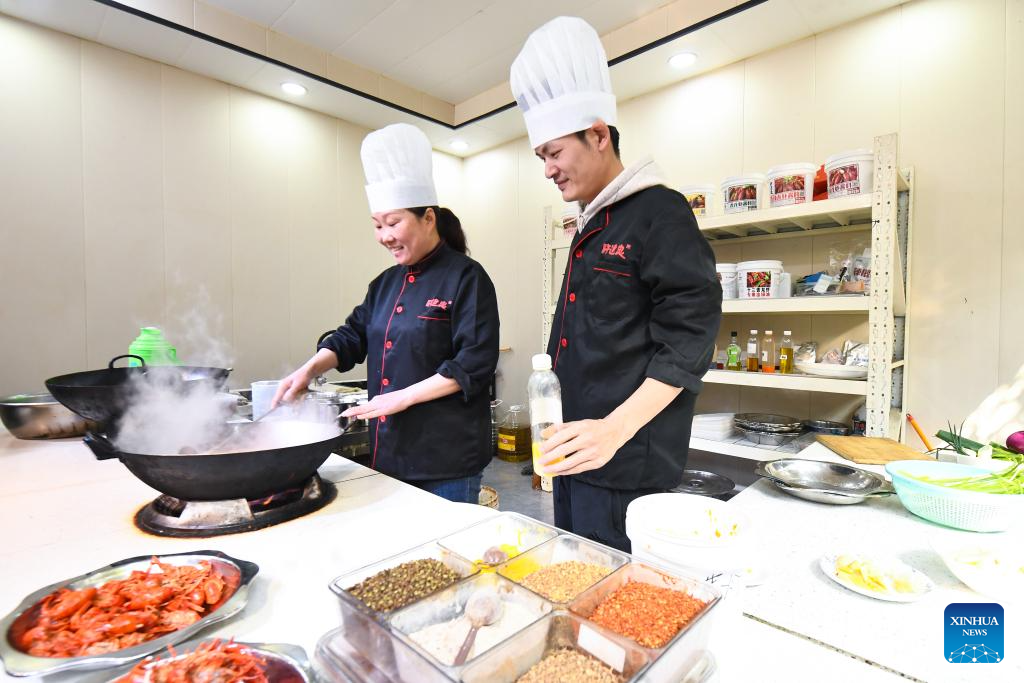 Trainees learn to cook crayfish at a training school in Xuyi County, east China's Jiangsu Province, March 8, 2025. As the temperature rises, crayfish are on the market in Xuyi County, a well-known crayfish production hub in China. In recent years, Xuyi has vigorously developed crayfish industry. The ecological breeding area of crayfish in the county has reached one million mu (about 66,667 hectares), and over 210,000 people are involved in the crayfish industry. Crayfish industry has become a boost to the local rural revitalization. (Photo by Yang Suping/Xinhua)