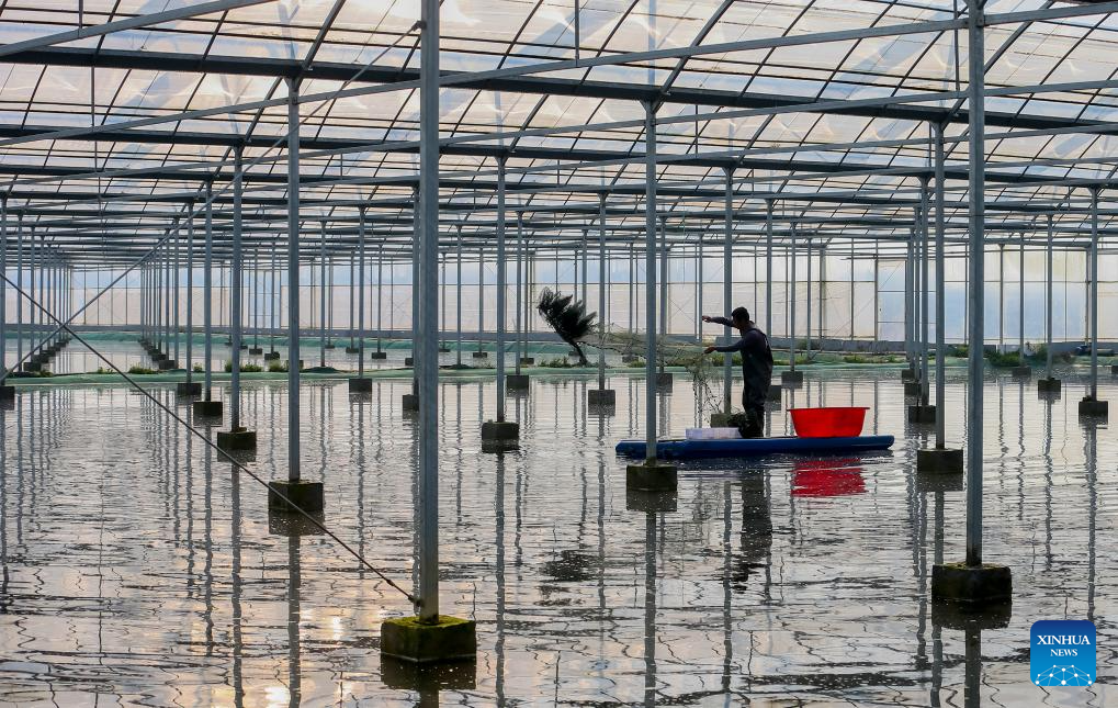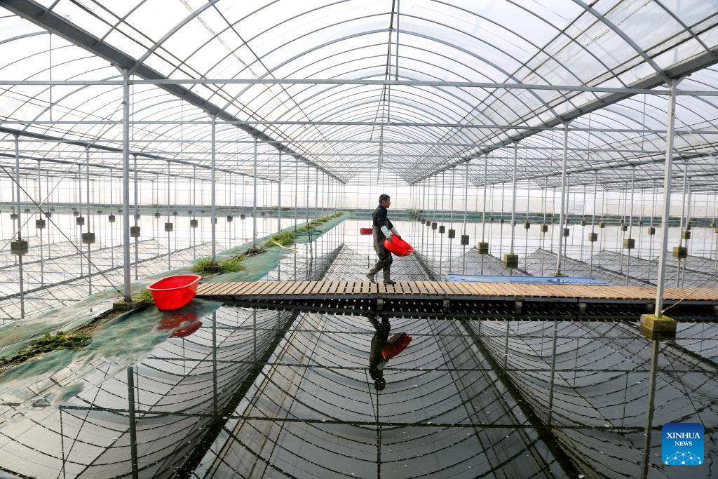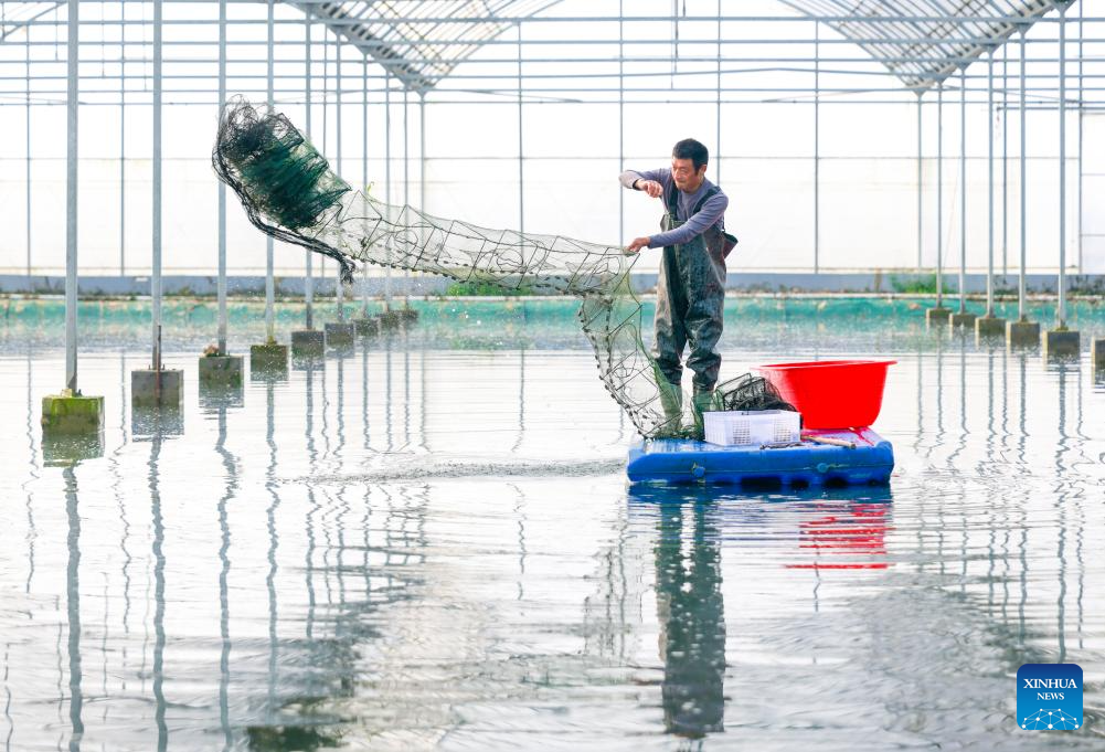 A farmer works in a crayfish field of a demonstration base in Xuyi County, east China's Jiangsu Province, March 8, 2025. As the temperature rises, crayfish are on the market in Xuyi County, a well-known crayfish production hub in China. In recent years, Xuyi has vigorously developed crayfish industry. The ecological breeding area of crayfish in the county has reached one million mu (about 66,667 hectares), and over 210,000 people are involved in the crayfish industry. Crayfish industry has become a boost to the local rural revitalization. (Photo by Wang Chun/Xinhua)