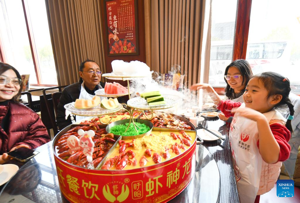 People taste crayfish at a restaurant in Xuyi County, east China's Jiangsu Province, March 8, 2025. As the temperature rises, crayfish are on the market in Xuyi County, a well-known crayfish production hub in China. In recent years, Xuyi has vigorously developed crayfish industry. The ecological breeding area of crayfish in the county has reached one million mu (about 66,667 hectares), and over 210,000 people are involved in the crayfish industry. Crayfish industry has become a boost to the local rural revitalization. (Photo by Yang Suping/Xinhua)
