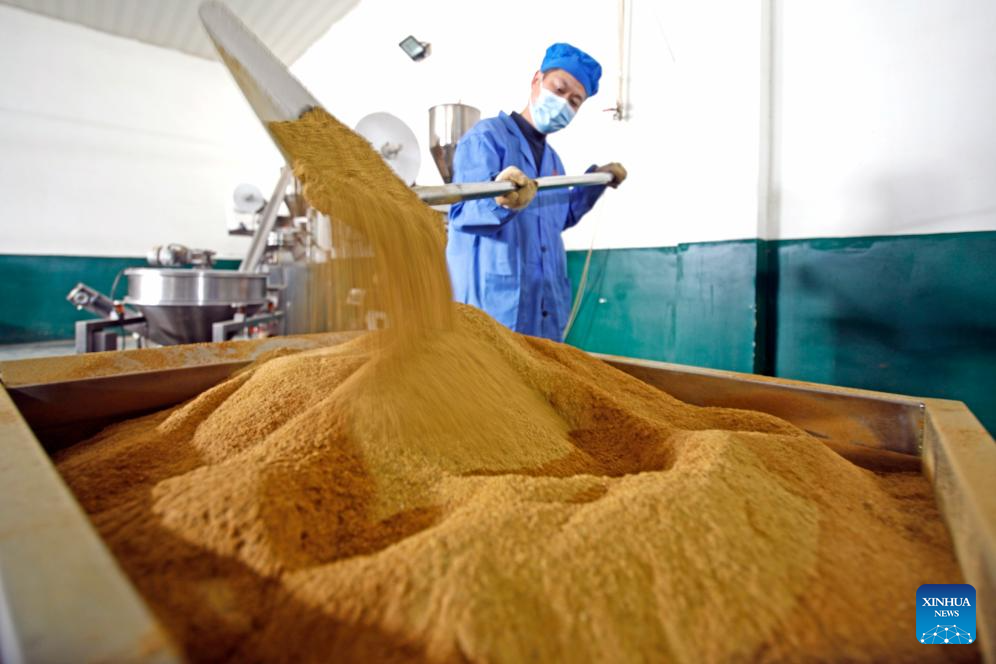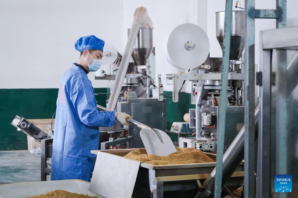 A worker operates at a crayfish condiment company in Xuyi County, east China's Jiangsu Province, March 8, 2025. As the temperature rises, crayfish are on the market in Xuyi County, a well-known crayfish production hub in China. In recent years, Xuyi has vigorously developed crayfish industry. The ecological breeding area of crayfish in the county has reached one million mu (about 66,667 hectares), and over 210,000 people are involved in the crayfish industry. Crayfish industry has become a boost to the local rural revitalization. (Photo by Gu Binbin/Xinhua)