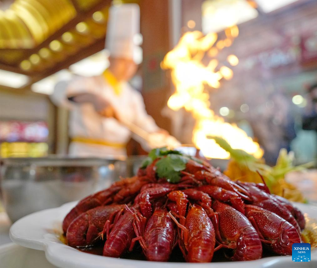 A chef cooks crayfish at a restaurant in Xuyi County, east China's Jiangsu Province, March 8, 2025. As the temperature rises, crayfish are on the market in Xuyi County, a well-known crayfish production hub in China. In recent years, Xuyi has vigorously developed crayfish industry. The ecological breeding area of crayfish in the county has reached one million mu (about 66,667 hectares), and over 210,000 people are involved in the crayfish industry. Crayfish industry has become a boost to the local rural revitalization. (Photo by Zhou Qiang/Xinhua)