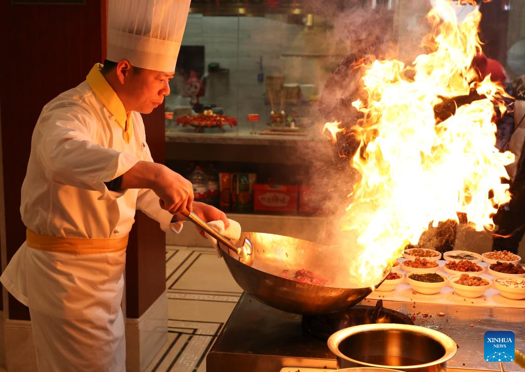 A chef cooks crayfish at a restaurant in Xuyi County, east China's Jiangsu Province, March 8, 2025. As the temperature rises, crayfish are on the market in Xuyi County, a well-known crayfish production hub in China. In recent years, Xuyi has vigorously developed crayfish industry. The ecological breeding area of crayfish in the county has reached one million mu (about 66,667 hectares), and over 210,000 people are involved in the crayfish industry. Crayfish industry has become a boost to the local rural revitalization. (Photo by Wang Jianmin/Xinhua)