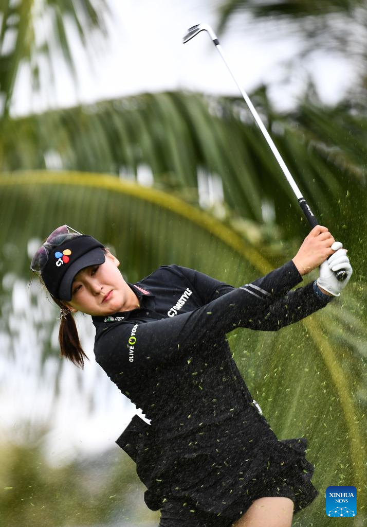 He Muni of China plays a shot during the third round of the Blue Bay LPGA golf tournament in Lingshui, south China's Hainan Province, March 8, 2025. (Xinhua/Yang Guanyu)