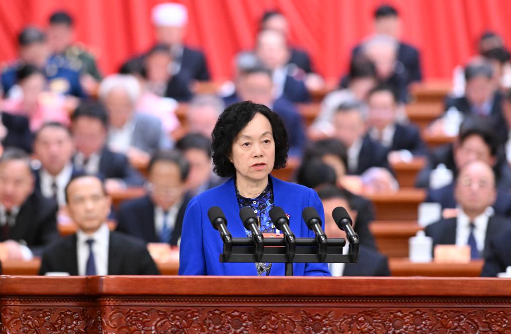 Cheng Hong, a member of the 14th National Committee of the Chinese People's Political Consultative Conference (CPPCC), speaks on behalf of the Central Committee of the China Democratic League at the third plenary meeting of the third session of the 14th CPPCC National Committee at the Great Hall of the People in Beijing, capital of China, March 9, 2025. (Xinhua/Rao Aimin)
