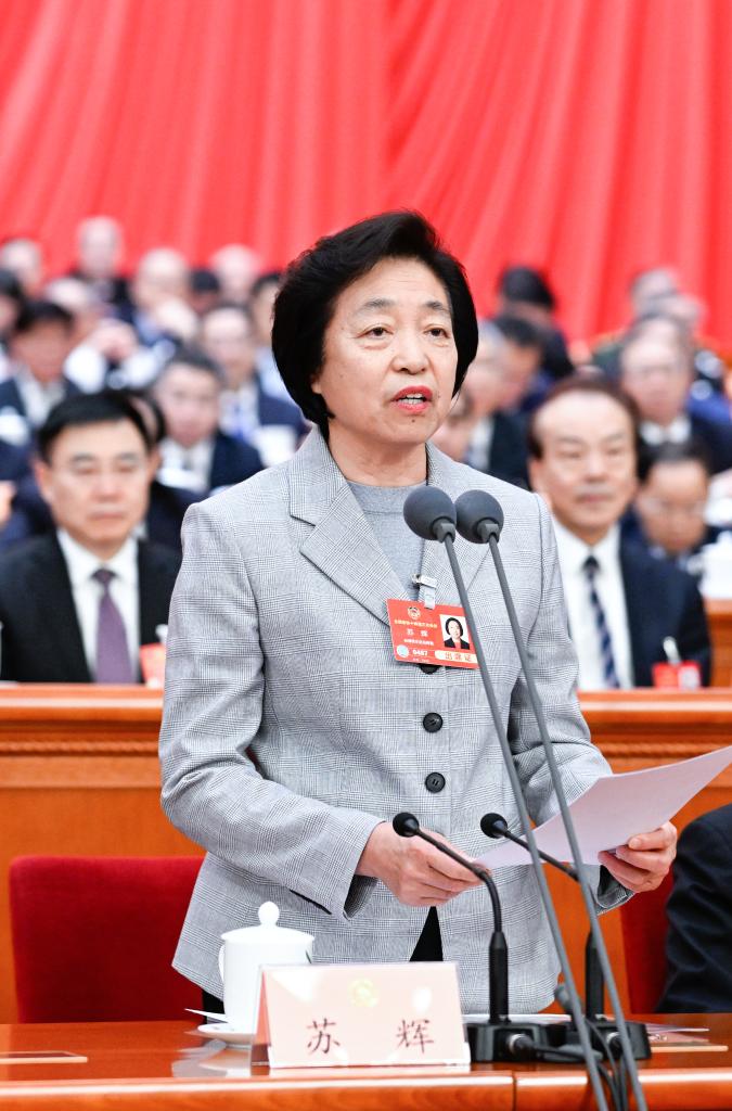 Sun Yeli, a member of the 14th National Committee of the Chinese People's Political Consultative Conference (CPPCC), speaks at the third plenary meeting of the third session of the 14th CPPCC National Committee at the Great Hall of the People in Beijing, capital of China, March 9, 2025. (Xinhua/Rao Aimin)
