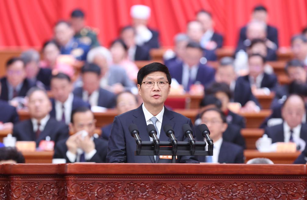 Piao Shilong, a member of the 14th National Committee of the Chinese People's Political Consultative Conference (CPPCC), speaks at the third plenary meeting of the third session of the 14th CPPCC National Committee at the Great Hall of the People in Beijing, capital of China, March 9, 2025. (Xinhua/Liu Weibing)