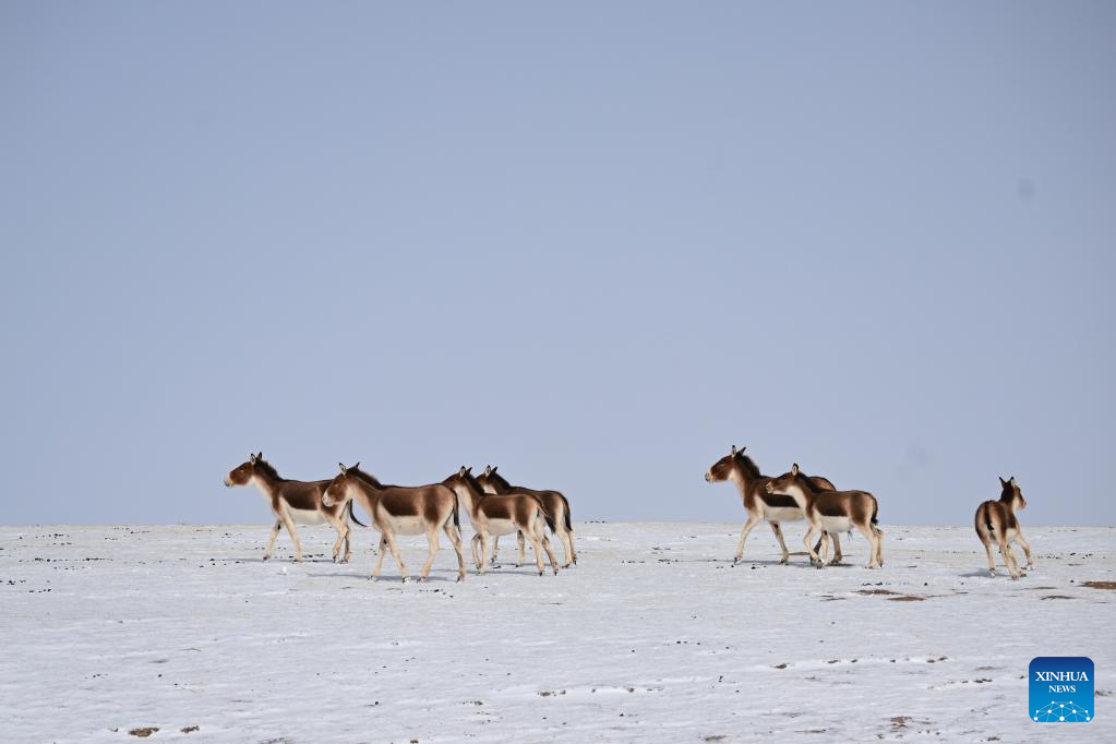 Tibetan wild donkeys are seen on snow-covered grassland in the Tibetan Autonomous Prefecture of Golog, northwest China's Qinghai Province, March 6, 2025. (Xinhua/Zhang Long)
