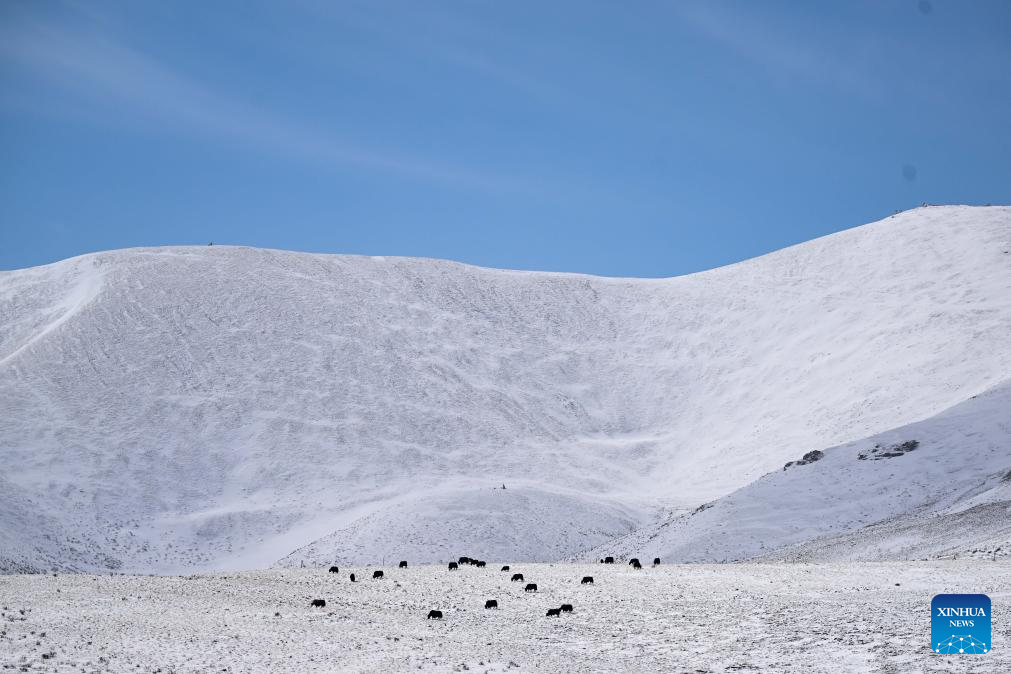Yaks are seen on snow-covered grassland in the Tibetan Autonomous Prefecture of Golog, northwest China's Qinghai Province, March 8, 2025. (Xinhua/Zhang Long)