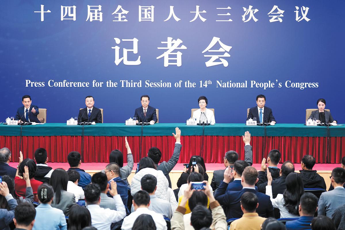 Chinese officials take questions from journalists at a news conference held in Beijing on Sunday for the third session of the 14th National People's Congress. (Feng Yongbin/China Daily)