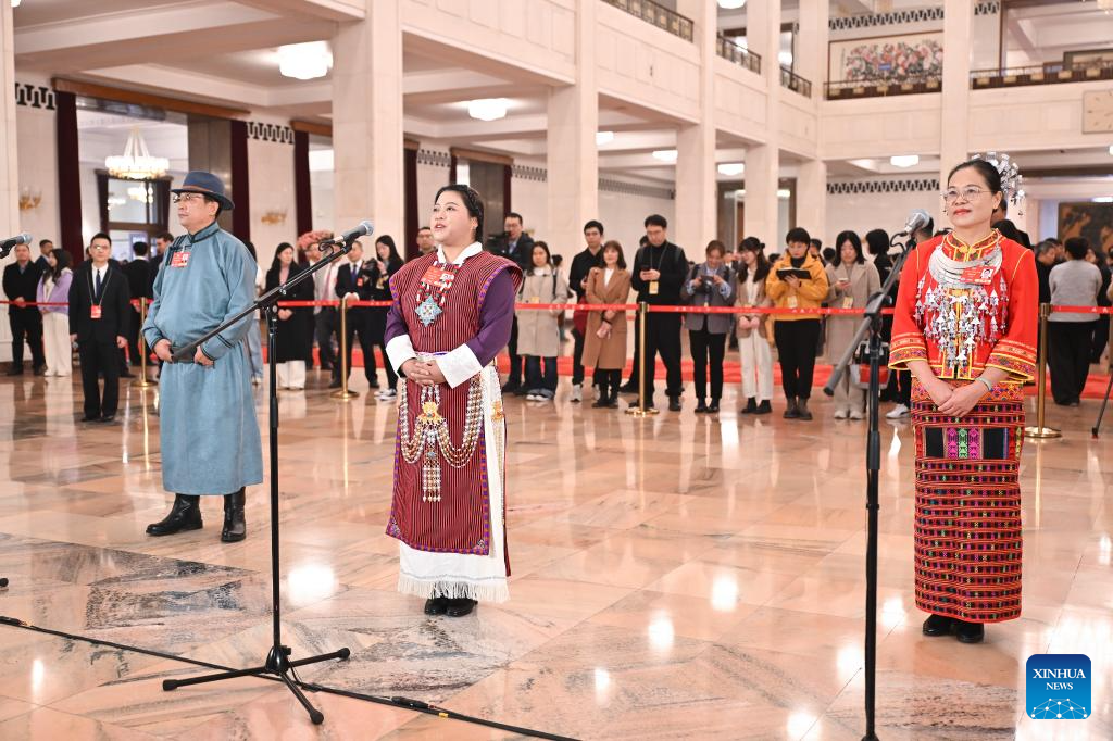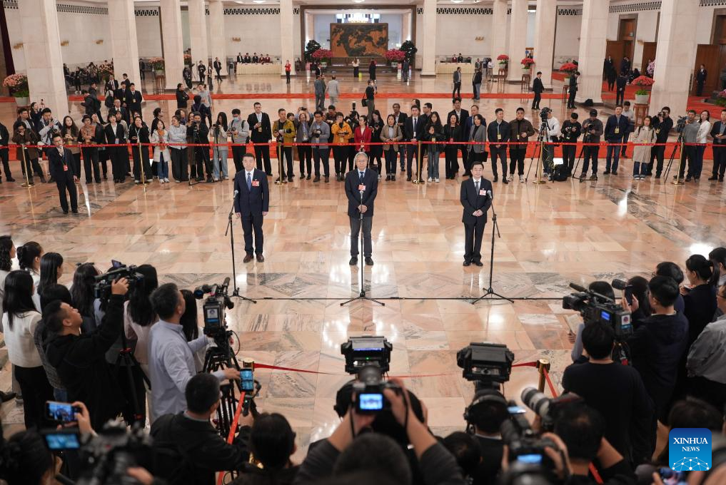 Members of the 14th National Committee of the Chinese People's Political Consultative Conference (CPPCC) attend a group interview ahead of the closing meeting of the third session of the 14th CPPCC National Committee at the Great Hall of the People in Beijing, capital of China, March 10, 2025. (Xinhua/Cai Yang)