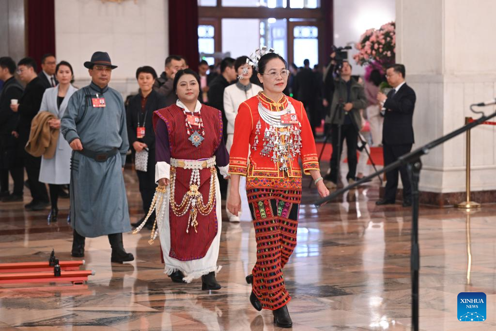 Members of the 14th National Committee of the Chinese People's Political Consultative Conference (CPPCC) arrive for a group interview ahead of the closing meeting of the third session of the 14th CPPCC National Committee at the Great Hall of the People in Beijing, capital of China, March 10, 2025. (Xinhua/Jin Liangkuai)