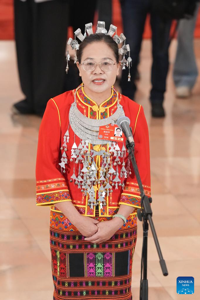 Huang Liping, a member of the 14th National Committee of the Chinese People's Political Consultative Conference (CPPCC), attends a group interview ahead of the closing meeting of the third session of the 14th CPPCC National Committee at the Great Hall of the People in Beijing, capital of China, March 10, 2025. (Xinhua/Cai Yang)