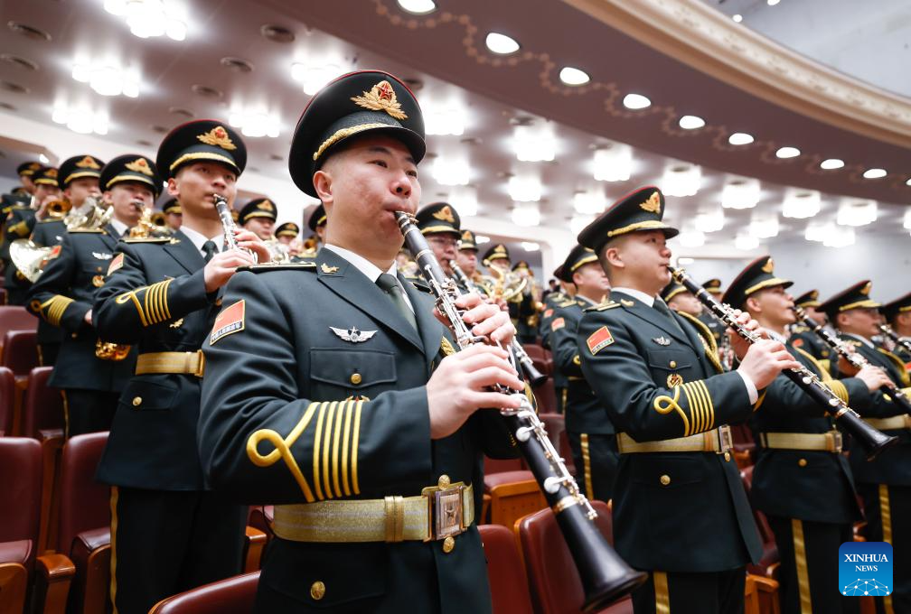 The military band of the Chinese People's Liberation Army performs at the closing meeting of the third session of the 14th National Committee of the Chinese People's Political Consultative Conference (CPPCC) at the Great Hall of the People in Beijing, capital of China, March 10, 2025. (Xinhua/Zhang Yuwei)