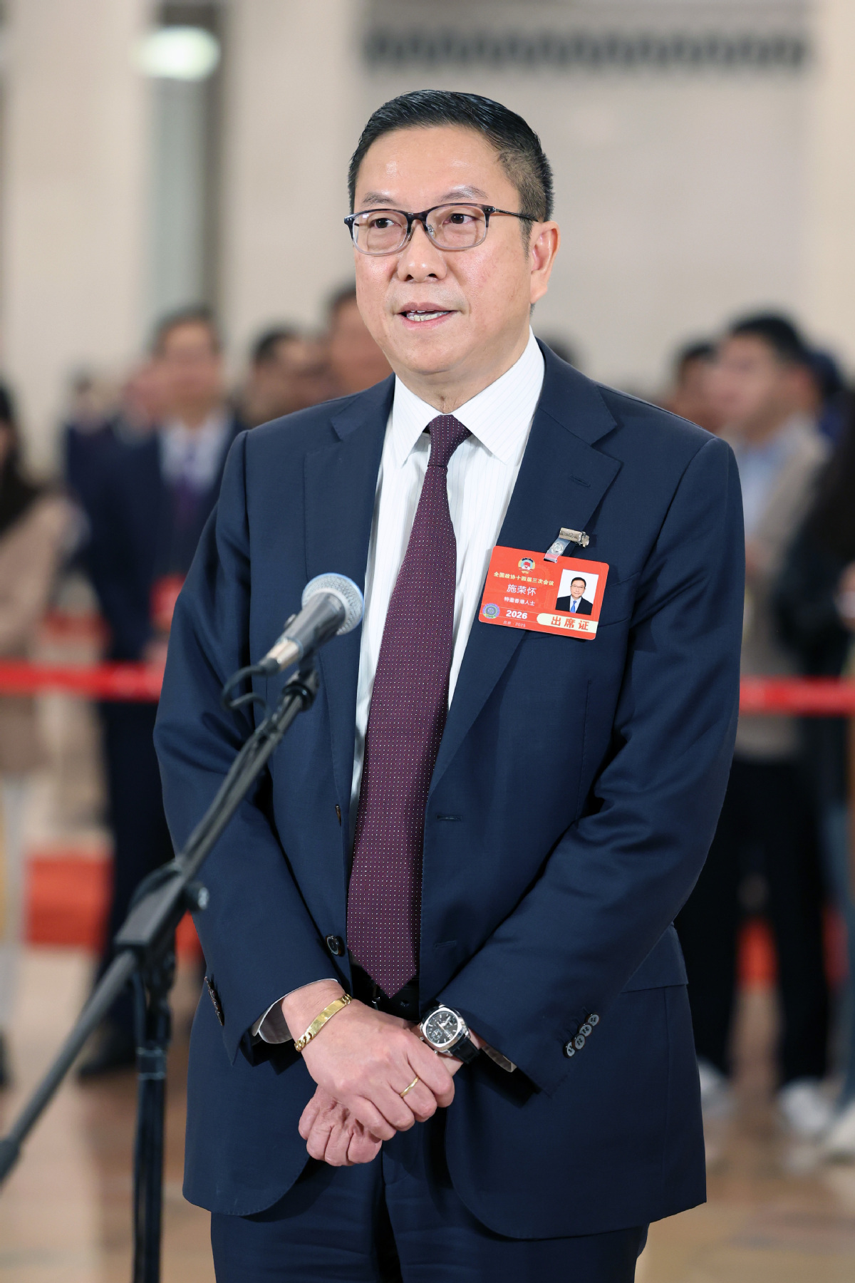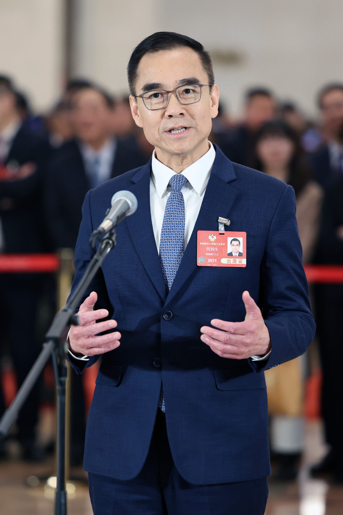 Ho Ion-sang, a member of the 14th National Committee of the Chinese People's Political Consultative Conference, attends a group interview ahead of the closing meeting of the third session of the 14th CPPCC National Committee at the Great Hall of the People in Beijing, March 10, 2025. (Wang Jing/chinadaily.com.cn)
