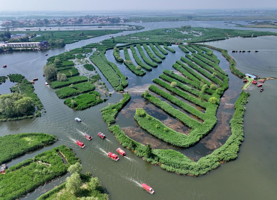 An aerial drone photo taken on May 8, 2024, shows boats touring Baiyangdian Lake in Xiong'an New Area, North China's Hebei province. (Photo/Xinhua)