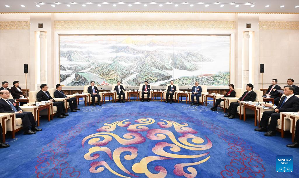 Wang Huning, a member of the Standing Committee of the Political Bureau of the Communist Party of China Central Committee and chairman of the Chinese People's Political Consultative Conference (CPPCC) National Committee, visits representatives of the press who covered the third session of the 14th CPPCC National Committee at the Great Hall of the People in Beijing, capital of China, March 10, 2025. Wang extended greetings to the journalists. (Xinhua/Xie Huanchi)