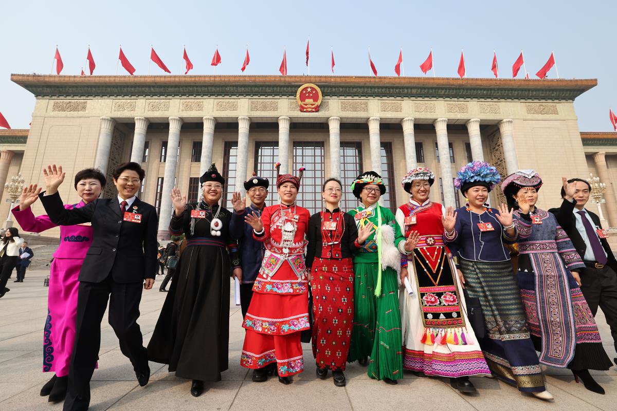 National political advisers pose in front of the Great Hall of the People in Beijing on Monday after the closing meeting of the third session of the 14th National Committee of the Chinese People's Political Consultative Conference. (Wang Jing/China Daily)