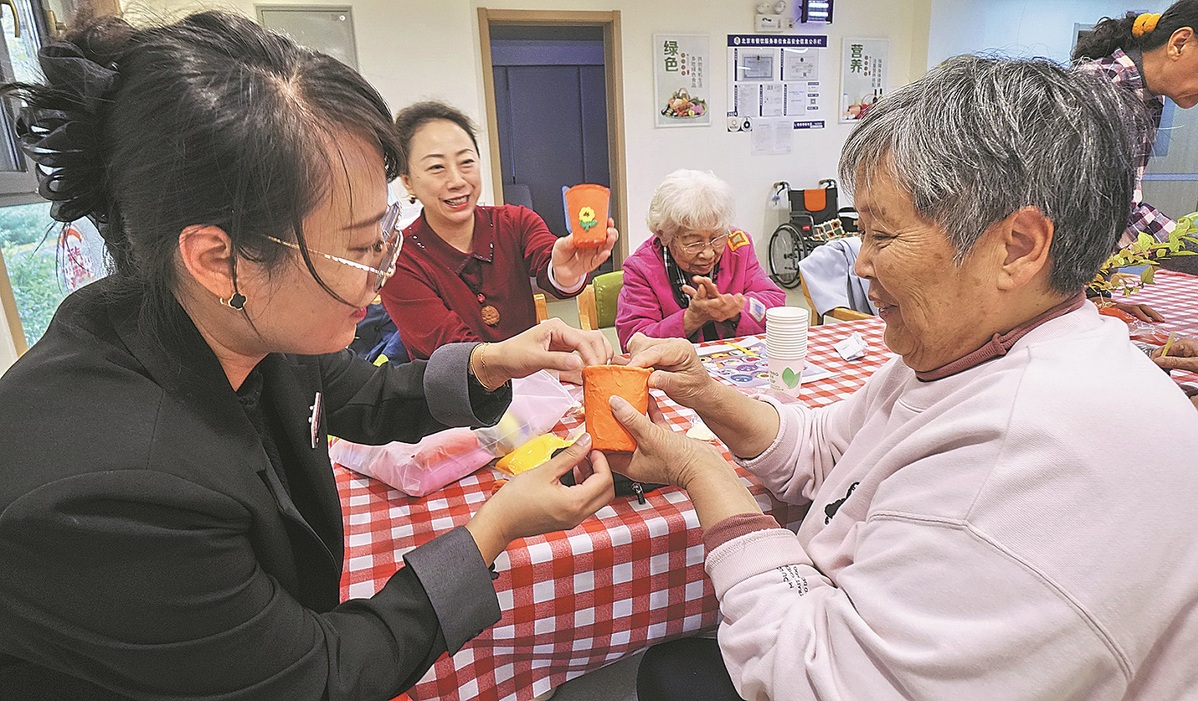 Workers at an elderly care center make flower pots with seniors in Beijing on Oct 31. (Li Xin/Xinhua)