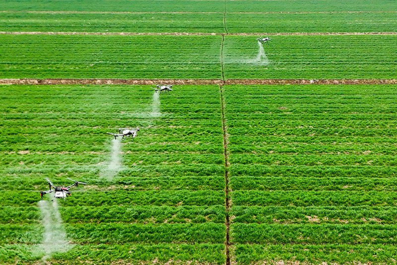Drones apply fertilizer to a wheat field at a farm in Tongling city, east China's Anhui Province. (Photo/Chu Zhuzhuan)