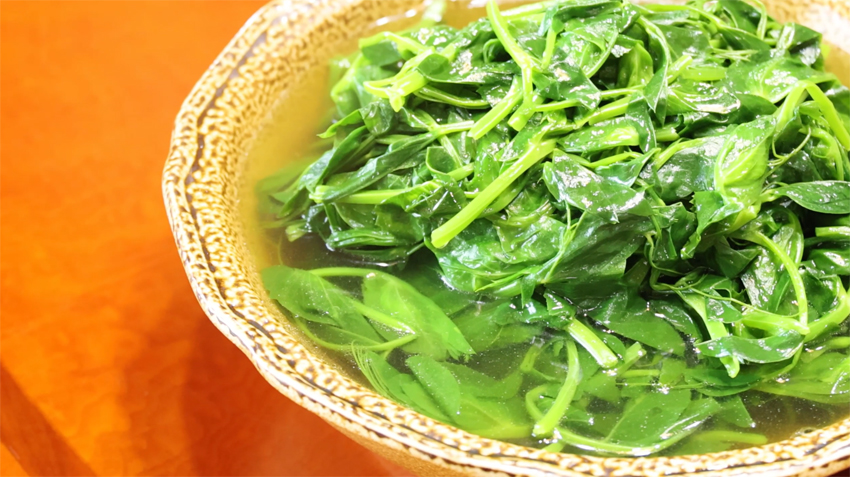 Photo shows pea shoot soup. (Photo courtesy of the Publicity Department of the Communist Party of China Yongde County Committee)