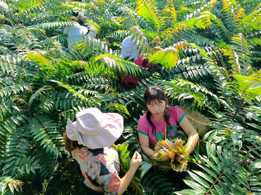 People pick Chinese mahogany shoots. (Photo courtesy of the People's Government of Xuangang township, Mangshi city, Dehong Dai and Jingpo Autonomous Prefecture)