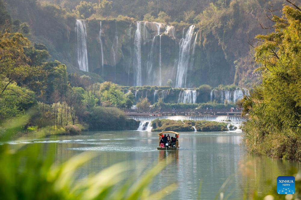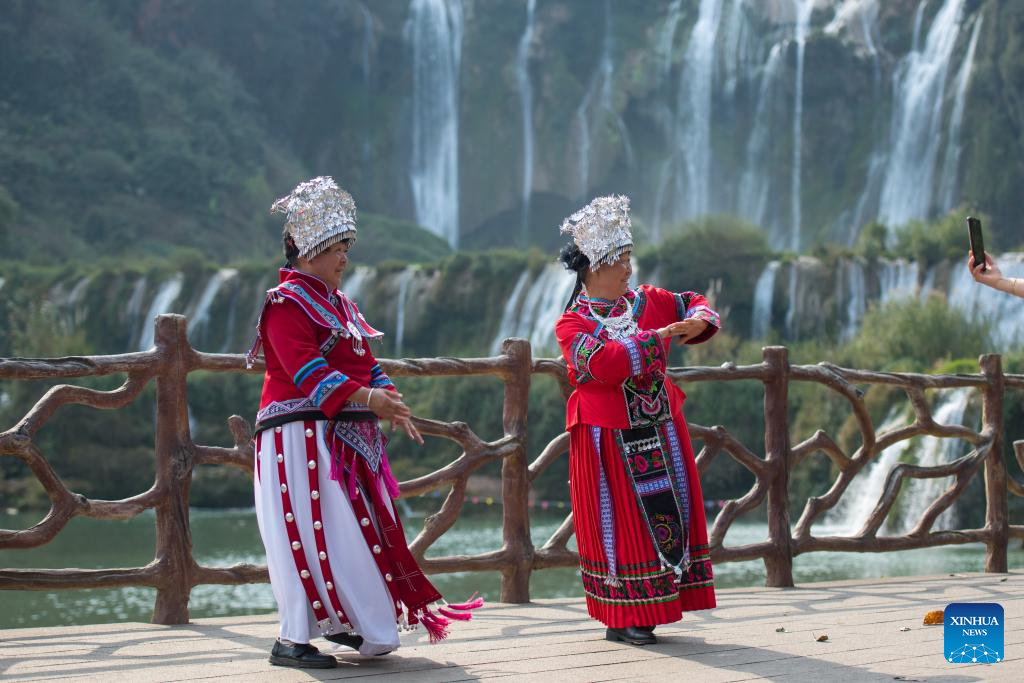Tourists pose for photos at the scenic area of Jiulong Waterfalls in Luoping County, southwest China's Yunnan Province, March 10, 2025. (Photo by Peng Yikai/Xinhua)